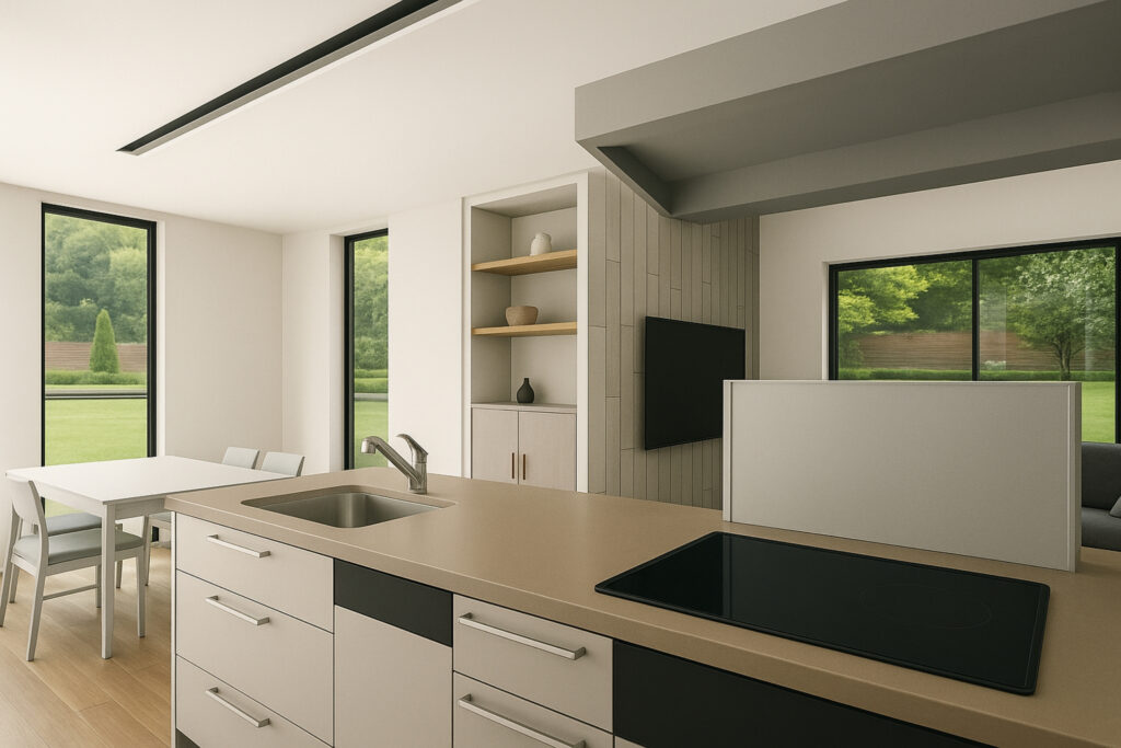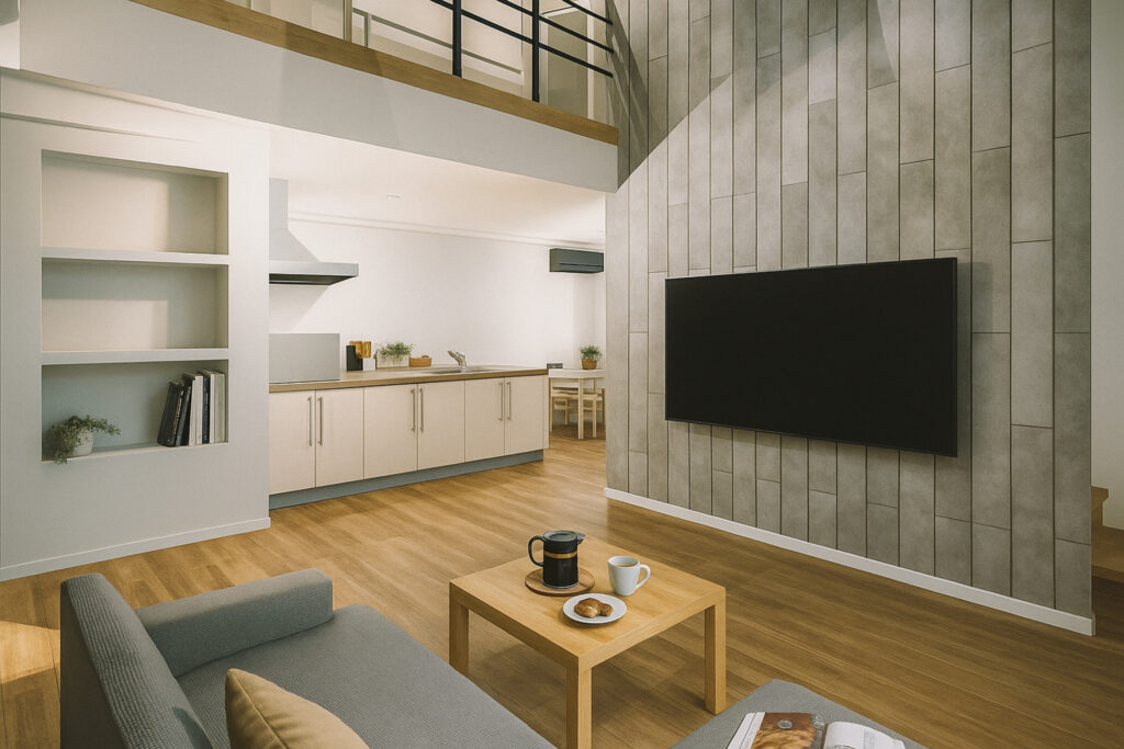 | ◎圧倒的な開放感とデザイン性!LDKの吹き抜け × SOLIDO(ソリド) LDKは、広々とした吹き抜けによる開放感と、質感が魅力のSOLIDO(ソリド)のアクセントが融合した、 スタイリッシュでデザイン性の高い空間です。自然な風合いの素材感が、家族が集うメイン空間に上質な雰囲気を加えます。 |