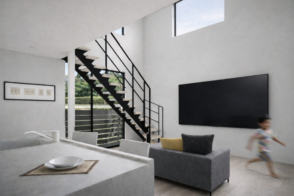 家事動線を短くする間取りと、開放感あふれる吹き抜けリビングを取り入れた住まいです。